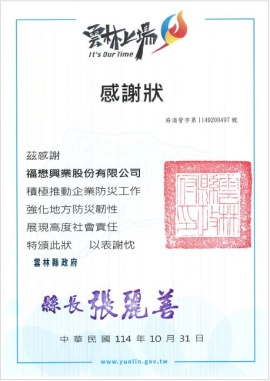 福懋興業配合政府辦理災害整備與協作座談會、聯合演習及訓練,並捐贈救災器材。