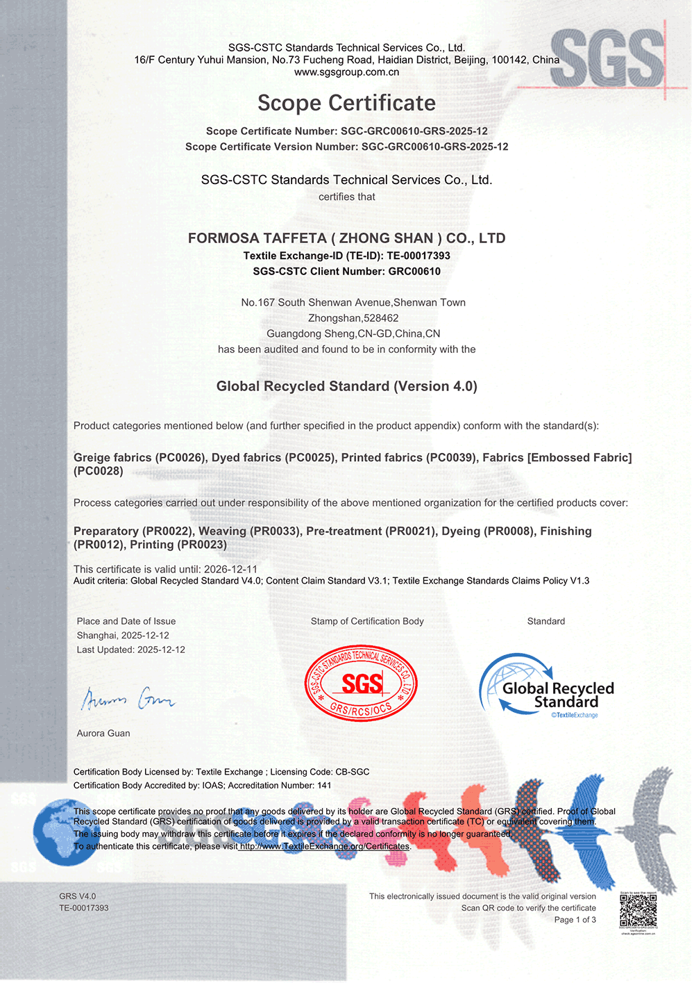 GRS證書_中國中山廠織廠與染廠
