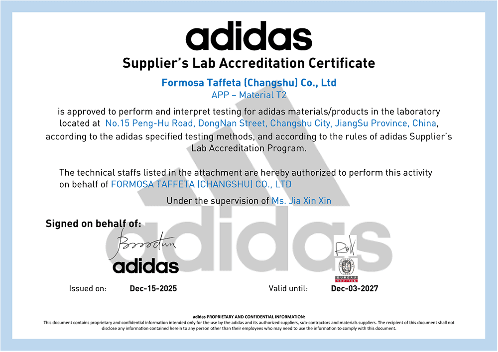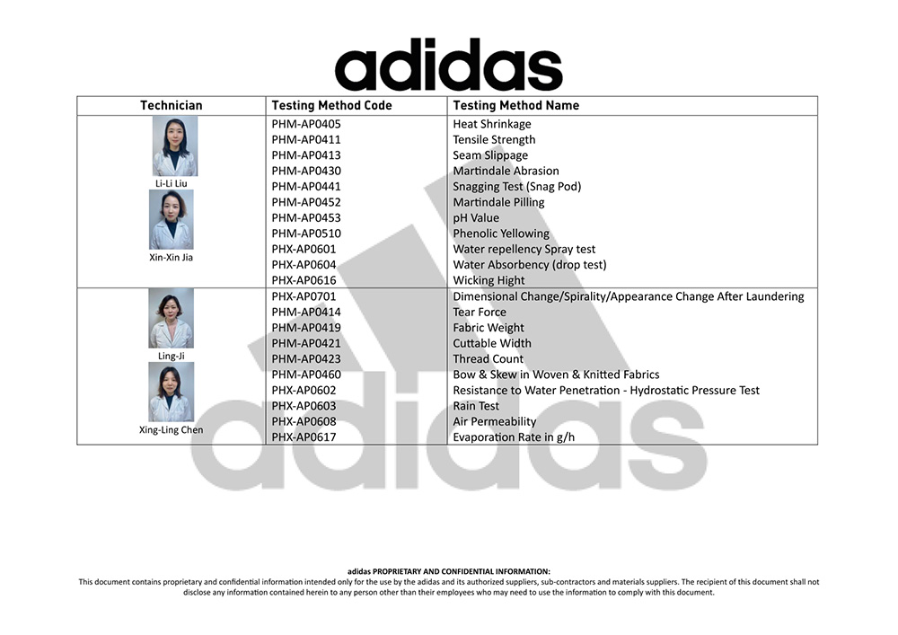 adidas Supplier's Lab Accreditation Certificate for Changshu Plant Technician