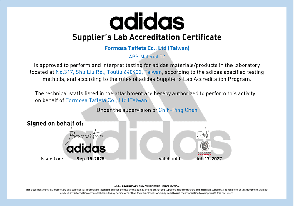 adidas Supplier's Lab Accreditation Certificate for FTC