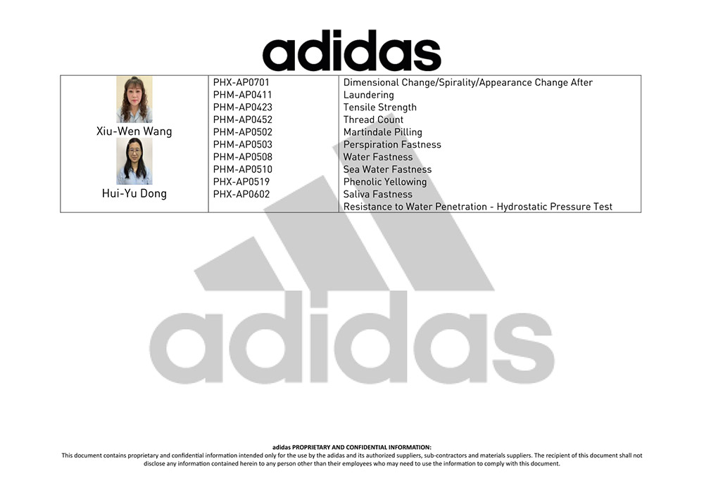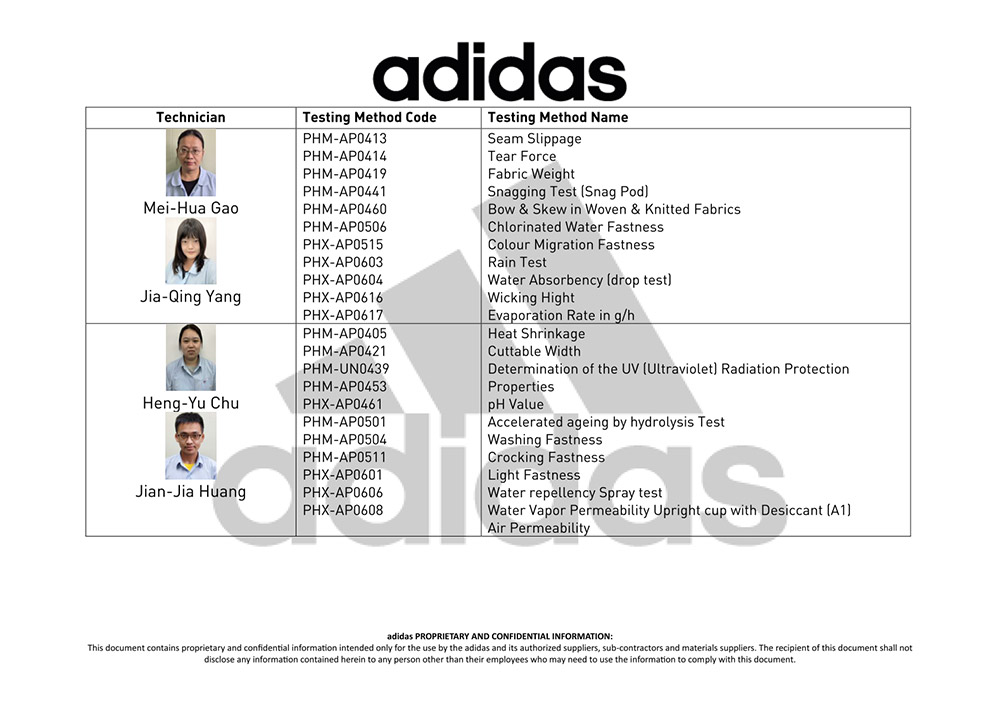 adidas Supplier's Lab Accreditation Certificate for FTC Technician