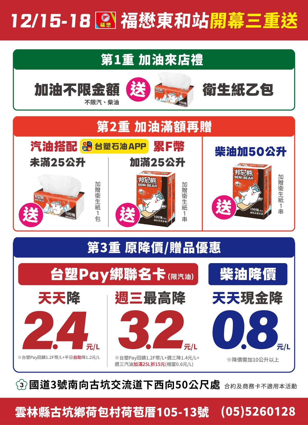 ①汽油+台塑APP 未滿25公升贈衛生紙1包
