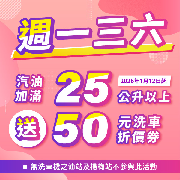 每週一、三、六,加汽油25公升以上 即送50元洗車折價券!