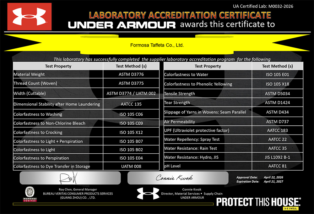UNDER ARMOUR Laboratory Accreditation Certificate for Taiwan