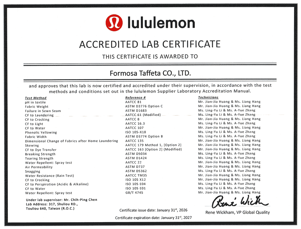 UNDER ARMOUR Laboratory Accreditation Certificates