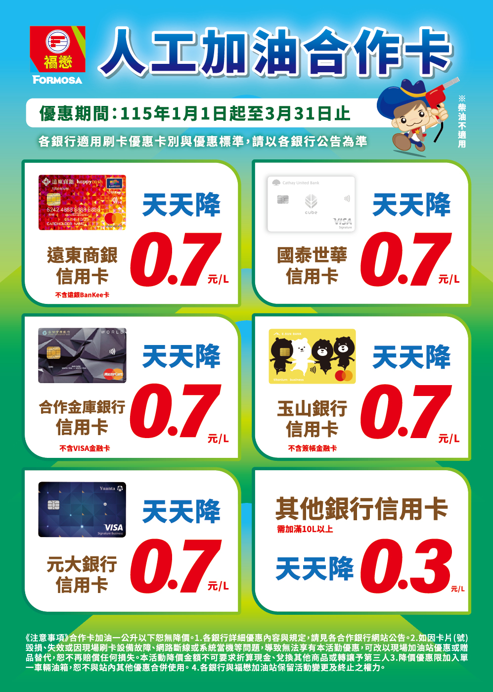每週三,汽油加滿25公升以上,每筆交易額外現折15元。