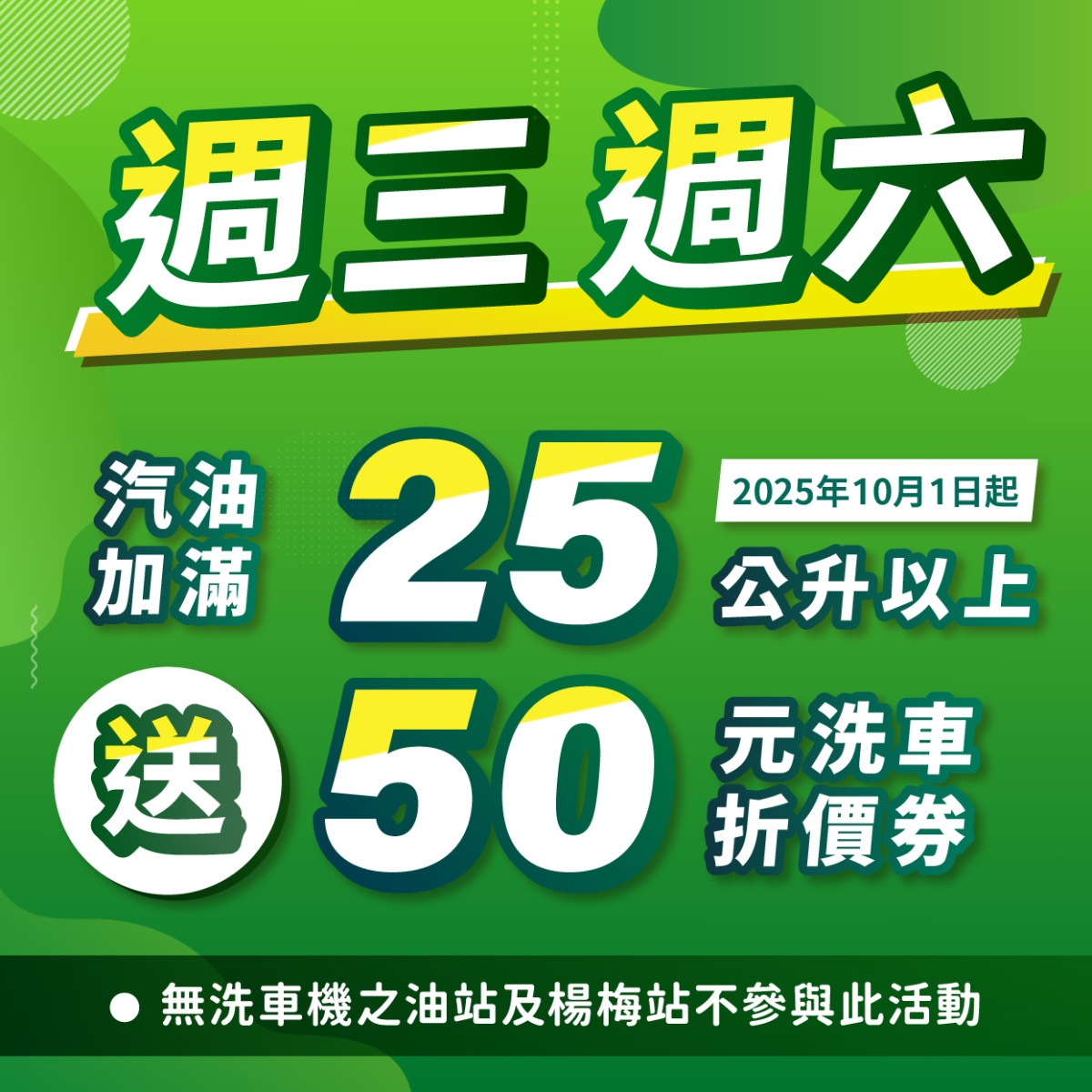 每週三、六,加汽油25公升以上 即送50元洗車折價券!