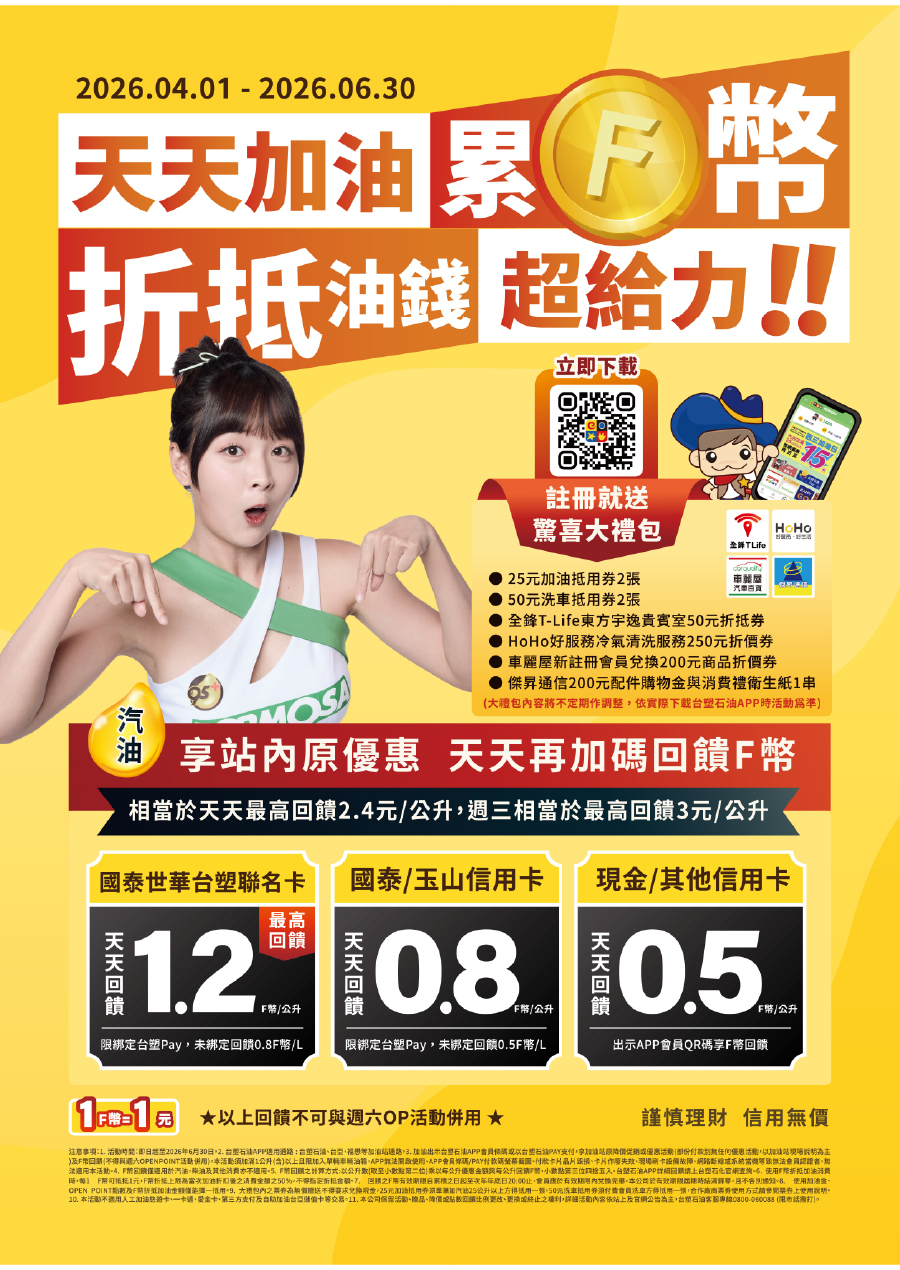 汽油+台塑聯名卡綁定台塑Pay天天加碼回饋1.2F幣/公升 再享原優惠!